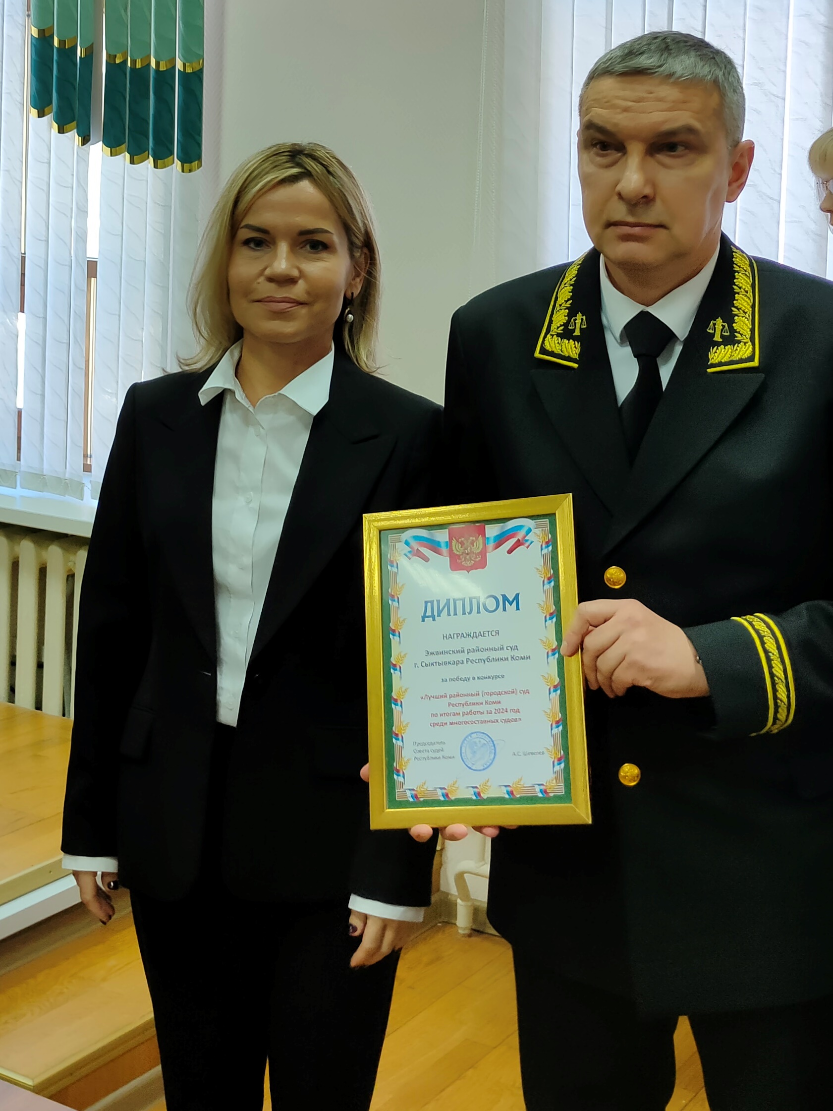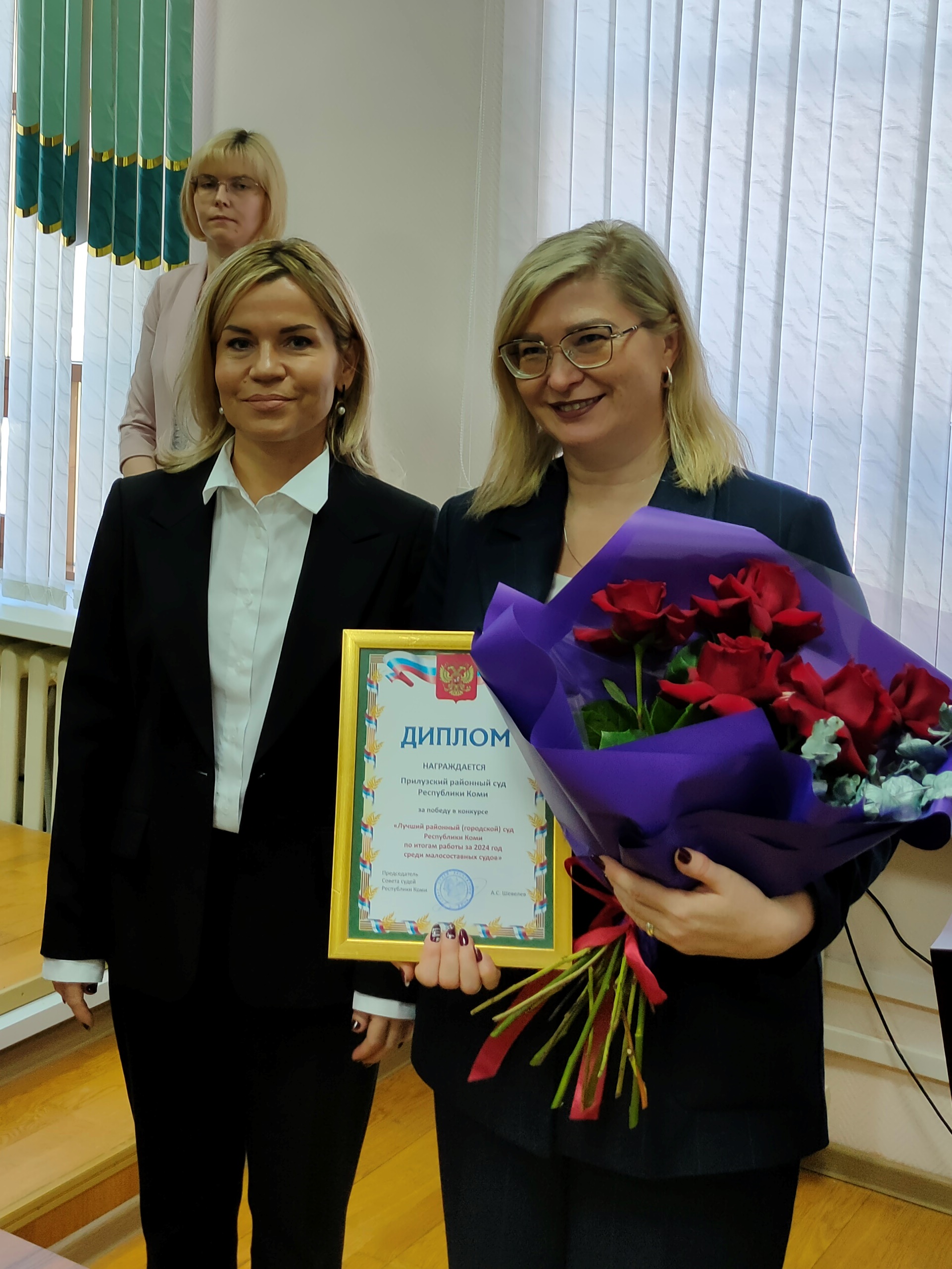 Конкурсная комиссия, созданная при Совете судей Республики Коми, очередной раз подвела итоги конкурса на звание «Лучший районный (городской) суд Республики Коми по итогам работы за год». Оценка деятельности судов производилась по таким критериям, как сроки рассмотрения судебных дел, качество и стабильность принятых решений, обеспечение доступа к информации о деятельности суда, соблюдение работниками аппарата суда исполнительской дисциплины. В конкурсе также учитывалась профилактическая, аналитическая и общественная работа суда в течение года. Конкурс проводился по двум группам судов. К первой группе отнесены суды со штатной численностью судей менее 9, ко второй – со штатной численностью судей 9 и более. Изучив представленные данные, конкурсная комиссия признала победителями в конкурсе на звание «Лучший районный (городской) суд Республики Коми по итогам работы за 2024 год»: Прилузский районный суд Республики Коми (среди малосоставных судов) и Эжвинский районный суд г. Сыктывкара Республики Коми (среди многосоставных судов). Елена Николаевна, начальник Управления Судебного департамента в Республике Коми, в торжественной обстановке поздравила победителей с заслуженной наградой, поблагодарив их за высокие достижения. Остальным судам пожелала удачи в победе в следующем году.